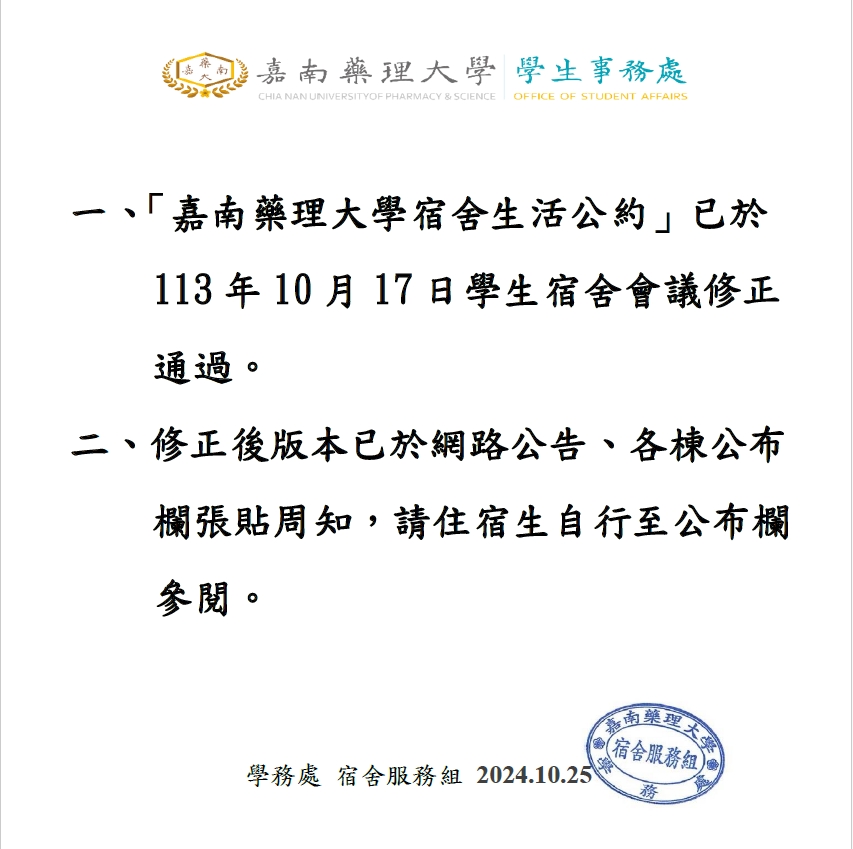 一、「嘉南藥理大學宿舍生活公約」已於113年10月17日學生宿舍會議修正通過。